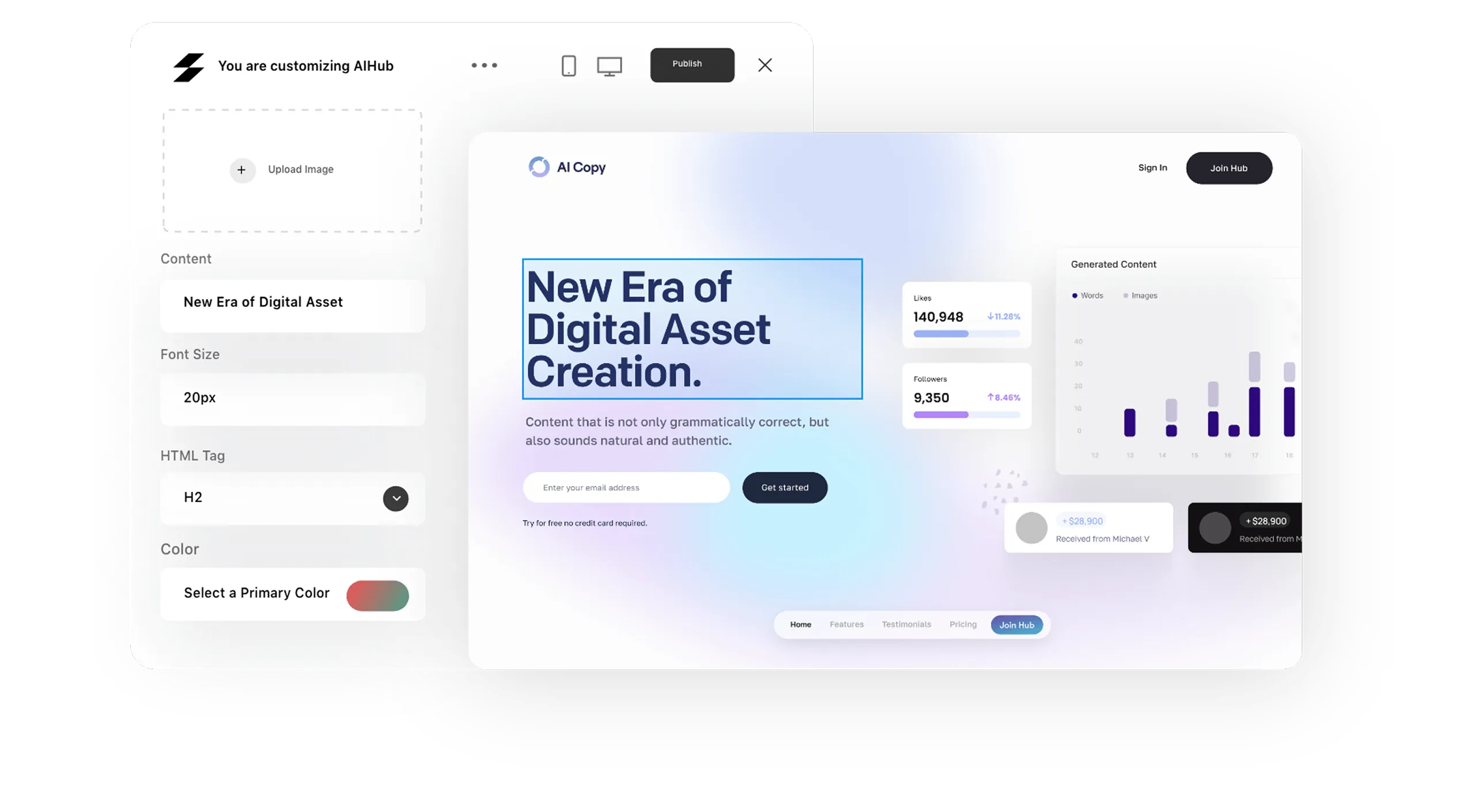 Įkelkite įmonęs logotipą bei vizualus. Jei tokių neturite, nuotraukas galėsite pasirinkti iš mūsų siūlomos plačios nuotraukų galerijos. Pritaikykite šriftus, spalvas, keiskite elementų išdėstymą. Tekstus jums taip pat parašysime. Papildomai galėsite užsisakyti hostingą, banerius, susikurti daugiau nei vieną puslapį.